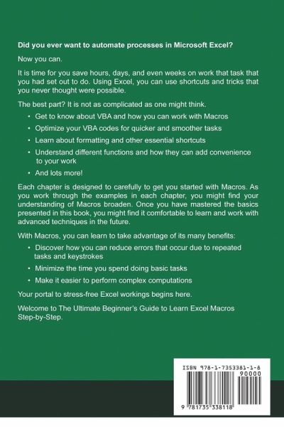 Did you ever want to automate processes in Microsoft Excel? Now you can. It is time for you save hours, days, and even weeks on work that task that you had set out to do. Using Excel, you can use shortcuts and tricks that you never thought were possible. The best part? It is not as complicated as one might think. Get to know about VBA and how you can work with Macros Optimize your VBA codes for quicker and smoother tasks Learn about formatting and other essential shortcuts Understand different functions and how they can add convenience to your work And lots more! Each chapter is designed to carefully to get you started with Macros. As you work through the examples in each chapter, you might find your understanding of Macros broaden. Once you have mastered the basics presented in this book, you might find it comfortable to learn and work with advanced techniques in the future. With Macros, you can learn to take advantage of its many benefits: Discover how you can reduce errors that occur due to repeated tasks and keystrokes Minimize the time you spend doing basic tasks Make it easier to perform complex computations Your portal to stress-free Excel workings begins here.