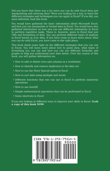 Did you know that there was a lot more you can do with Excel than just manipulating and entering data? Were you looking for a way to learn the different strategies and techniques you can apply in Excel? If you did, you must definitely read this book. You would have gathered the basic information about Microsoft Excel, and how you can manipulate or format data in Excel. You would have also gathered information on how you can use different statements in Excel to perform repetitive tasks. There is, however, more to Excel that just VBA and formatting of data. You can perform different types of analysis in Excel based on your data. If you have come to learn more about what you can do with Excel, you have come to the right place. This book sheds some light on the different strategies that you can use in Excel. You will learn more about how to paste data, what types of formatting you can use and how you can use different formulae and graphs to help you understand your data better. Over the course of this book, you will gather information on: How to add or delete rows and columns in a worksheet How to identify and remove duplicates in the data set How to use the Paste Special option in Excel How to sort data using multiple sort levels Different functions that one can use in Excel to perform numerous operations How to use Autofill Simple mathematical operations that can be performed in Excel Some shortcuts in Excel If you are looking at different ways to improve your skills in Excel, Grab a copy of this book NOW.