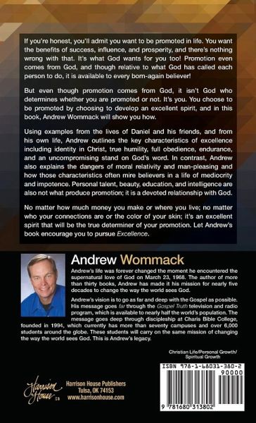 If you’re honest, you’ll admit you want to be promoted in life. You want the benefits of success, influence, and prosperity, and there’s nothing wrong with that. It’s what God wants for you too! Promotion even comes from God, and though relative to what God has called each person to do, it is available to every born-again believer! But even though promotion comes from God, it isn’t God who determines whether you are promoted or not. It’s you. You choose to be promoted by choosing to develop an excellent spirit, and in this book, Andrew Wommack will show you how. Using examples from the lives of Daniel and his friends, and from his own life, Andrew outlines the key characteristics of excellence including identity in Christ, true humility, full obedience, endurance, and an uncompromising stand on God’s word. In contrast, Andrew also explains the dangers of moral relativity and man-pleasing and how those characteristics often mire believers in a life of mediocrity and impotence. Personal talent, beauty, education, and intelligence are also not what produce promotion; it is a devoted relationship with God. No matter how much money you make or where you live; no matter who your connections are or the color of your skin; it’s an excellent spirit that will be the true determiner of your promotion. Let Andrew’s book encourage you to pursue Excellence.