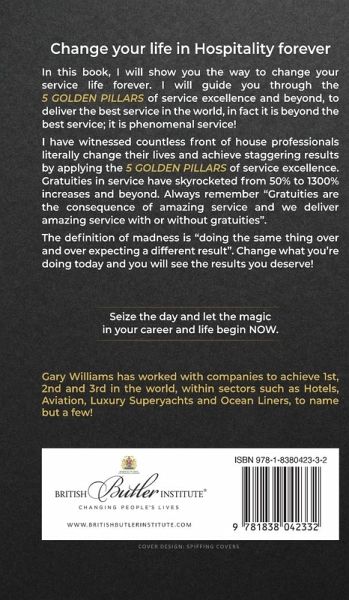 Change your life in Hospitality forever. In this book, I will show you the way to change your service life forever. I will guide you through the 5 GOLDEN PILLARS of service excellence and beyond, to deliver the best service in the world, in fact it is beyond the best service; it is phenomenal service! I have witnessed countless front of house professionals literally change their lives and achieve staggering results by applying the 5 GOLDEN PILLARS of service excellence. Gratuities in service have skyrocketed from 50% to 1300% increases and beyond. Always remember "Gratuities are the consequence of amazing service and we deliver amazing service with or without gratuities". The definition of madness is "doing the same thing over and over expecting a different result". Change what you're doing today and you will see the results you deserve! Seize the day and let the magic in your career and life begin NOW. Gary Williams has worked with companies to achieve 1st, 2nd and 3rd in the world, within sectors such as Hotels, Aviation, Luxury Superyachts and Ocean Liners, to name but a few!