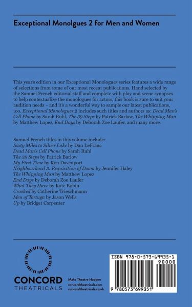 This year's edition in our Exceptional Monologues series features a wide range of selections from some of our most recent publications. Hand selected by the Samuel French editorial staff and complete with play and scene synopses to help contextualize the monologues for actors, this book is sure to suit your audition needs - and it's a wonderful way to sample our latest publications, too. Exceptional Monologues 2 includes such titles and authors as: Dead Man's Cell Phone by Sara