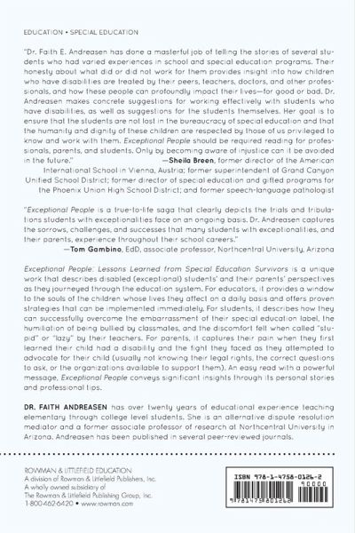 Exceptional People: Lessons Learned from Special Education Survivors is a unique work that describes disabled (exceptional) students' and their parents' perspectives as they journeyed through the education system. An easy read with a powerful message, this educator and family resource conveys significant insights through its personal stories and professional tips.