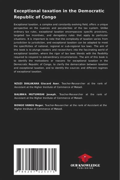 Exceptional taxation, a complex and constantly evolving field, offers a unique perspective on the nuances and peculiarities of the tax system. Unlike ordinary tax rules, exceptional taxation encompasses specific provisions, targeted tax incentives, and derogatory rules that apply to particular situations. It is important to note that the complexity of taxation varies from jurisdiction to jurisdiction, and exceptional taxation can be adapted to meet the specificities of national, regional or sub-regional tax laws. The aim of this book is to plunge readers and researchers into the fascinating world of exceptional taxation, where the rigor of tax laws blends with the flexibility required to respond to extraordinary circumstances. The aim of this book is to identify the motivations or reasons for exceptional taxation in the Democratic Republic of Congo, to clarify the demarcation between taxation and exceptional taxation, and to identify the sources and different regimes of exceptional taxation.
