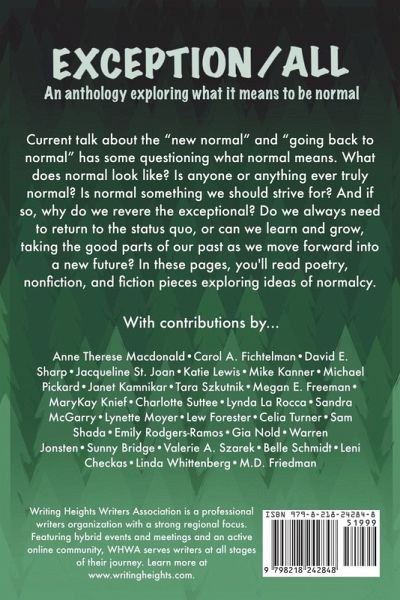 Current talk about the "new normal" and "going back to normal" has some questioning what normal means. What does normal look like? Is anyone or anything ever truly normal? Is normal something we should strive for? And if so, why do we revere the exceptional? Do we always need to return to the status quo, or can we learn and grow, taking the good parts of our past as we move forward into a new future? In these pages, you'll read poetry, nonfiction, and fiction pieces exploring ideas of normalcy as experienced by our authors.