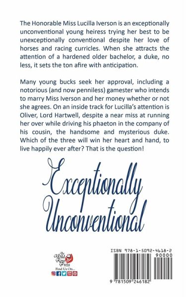 The Honorable Miss Lucilla Iverson is an exceptionally unconventional young heiress trying her best to be unexceptionally conventional despite her love of horses and racing curricles. When she attracts the attention of a hardened older bachelor, a duke, no less, it sets the ton afire with anticipation. Many young bucks seek her approval, including a notorious (and now penniless) gamester who intends to marry Miss Iverson and her money whether or not she agrees. On an inside track for Lucilla's attention is Oliver, Lord Hartwell, despite a near miss at running her over while driving his phaeton in the company of his cousin, the handsome and mysterious duke. Which of the three will win her heart and hand, to live happily ever after? That is the question!