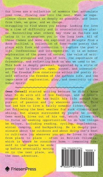 Our lives are a collection of moments that accumulate over time, flowing one into the next. When we experience those moments as deeply as possible, and learn from them, we grow, and we change. Struggling to find where you belong. Looking for love in a time of difficulty and in counterintuitive places. Reconciling what others may view as failure and using it to strengthen you in the long term. All of these themes and more are explored in Excerpts From a Book Untitled, a collection of free-verse poetry that plays with form and convention to explore the poet's life. Confessional and introspective, it is an honest exploration of the power of nature, the value of writing, the struggles and joys of love, the importance of friendship, and reflecting back on who we used to be. This book is deeply personal, supported by a style of poetry that is creative, open, honest, and unrestricted. The freedom from constraints within the poetry itself reflects the freedom of the authors life, and the importance of exploration, play, and creativity to the human spirit.