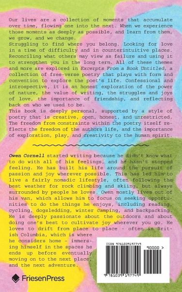 Our lives are a collection of moments that accumulate over time, flowing one into the next. When we experience those moments as deeply as possible, and learn from them, we grow, and we change. Struggling to find where you belong. Looking for love in a time of difficulty and in counterintuitive places. Reconciling what others may view as failure and using it to strengthen you in the long term. All of these themes and more are explored in Excerpts From a Book Untitled, a collection of free-verse poetry that plays with form and convention to explore the poet's life. Confessional and introspective, it is an honest exploration of the power of nature, the value of writing, the struggles and joys of love, the importance of friendship, and reflecting back on who we used to be. This book is deeply personal, supported by a style of poetry that is creative, open, honest, and unrestricted. The freedom from constraints within the poetry itself reflects the freedom of the authors life, and the importance of exploration, play, and creativity to the human spirit.