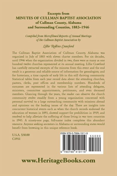 The Cullman Baptist Association of Cullman County, Alabama was organized in July of 1883 with eleven charter members. For six decades, until 1946 when the organization divided in two, there were as many as one hundred twelve churches represented at its annual meeting. Lillie Crawford has carefully extracted excerpts of the minutes from this event and the end result is a generous and reliable source of information for genealogists; and for historians, a time capsule of early life in this still thriving community. Statistical tables from each year record data about the attending churches, pastors, clerks, post offices and membership numbers. Hundreds of surnames are represented in the various lists of attending delegates, ministers, committee appointments, petitioners, and even deceased members. Glancing through the years, the reader can observe the church community evolve steadily from a young organization concerned with personal survival to a large outreaching community with missions abroad and opinions on the leading issues of the day. There are insights into concurrent historical events such as when the church records endorsed the education of women in 1893, showed support for prohibition in 1919, and resolved to help alleviate the suffering of those living in war torn countries in 1945. A ninety-one page, full-name index completes this abundant resource. Anyone seeking ancestors in Alabama or surrounding states would benefit from browsing in this unique reference book.