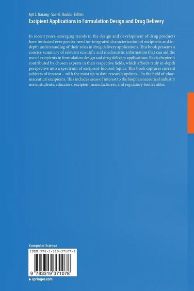 Forward.- Excipient Applications in Formulation Design and Drug Delivery: An Introduction.- Drug Excipient Interactions.- Reactive Impurities in Excipients.- Reactive Impurities in PEG: A Case Study.- Impact of Excipient Interactions on Solid Dosage Form Stability.- Protein - Surfactant Interactions at the Air-Water Interface.- Smart Polymers in Drug Delivery.- Tailoring the Oral Release of Drugs Using Polymeric Excipients.- Solid lipid excipients as matrix agents for sustained drug delivery.- Impact of Excipient Interactions on Drug Bioavailability from Solid Dosage Forms.- Biopolymers in Medical Implants.- Selection of Excipients Based on the Biopharmaceutics Classification System of Drugs.- Excipient Selection in Oral Solid Dosage Formulations Containing Moisture Sensitive Drugs.- Silicone excipients in pharmaceutical drug delivery applications.- Excipients that Facilitate Amorphous Drug Stabilization.- Excipients in Pediatric Formulations: Biopharmaceutical and Toxicological Considerations.- Role of Innovator Product Characterization in Generic Product Development.- Addressing Excipient Variability in Formulation Design and Drug Development.- Improved Polymer Functionality by Cross-linking with Glutaraldehyde to Achieve Controlled Drug Release.- Excipient Design by Co-processing for Direct Compression Applications.- Excipients and Non-medicinal Agents as Active Pharmaceutical Ingredients.- Drug Delivery Applications of Chitosan and its Derivatives.