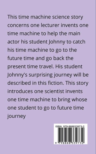 ¿ This time machine science story concerns one lecturer invents one time machine to help the main actor his student Johnny to catch his time machine to go to the future time and go back the present time travel. His student Johnny's surprising journey will be described in this fiction. This story introduces one scientist invents one time machine to bring whose one student to go to future time journey. It is my first science fiction novel written and a science comedy, a time travel science story. This scenario of this series takes place in four stages of journey.