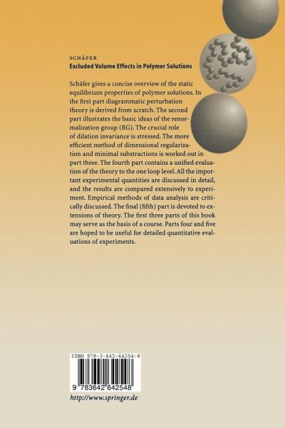 Schäfer gives a concise overview of the static equilibrium properties of polymer solutions. In the first part diagrammatic perturbation theory is derived from scratch. The second part illustrates the basic ideas of the renormalization group (RG). The crucial role of dilation invariance is stressed. The more efficient method of dimensional regularization and minimal subtractions is worked out in part three. The fourth part contains a unified evaluation of the theory to the one loop level. All the important experimental quantities are discussed in detail, and the results are compared extensively to experiment. Empirical methods of data analysis are critically discussed. The final (fifth) part is devoted to extensions of theory. The first three parts of this book may serve as the basis of a course. Parts four and five are hoped to be useful for detailed quantitative evaluations of experiments.