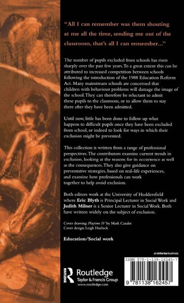 Part I. Trends and Theoretical Overview 1. Exlusions - Trends and Issues 2. Stories of Exclusion: Natural and Unnatural Selection 3. The Signal of Failure: School Exclusions and the Market System of Education 4. Government Policy and Disadvantaged Children 5. Black Boys Excluded from School: Race or Masculinity Issues? 6. No Home, No School, No Future: Exclusions and Children Who Are 'Looked After' 7. Professionals, Children and Power Part II. Consequences of Exclusions 8. The Cost of Primary School Exclusions 9. The Effects of Waiting on Excluded Children 10. Who Excludes Whom? The Personal Experience of Exclusion 11. Tales from the Exclusion Zone: The Views of Teachers and Pupils 12. Damaged Goods? An Interpretation of Excluded Pupil's Perceptions of Schooling Part III. Preventative Strategies and Policies 13. The Staff Sharing Scheme: A School-Based Management System for Working with Challenging Child Behaviour 14. Resisting the Trend to Exclude 15. Primary School Exclusions: The Need for Integrated Solutions 16. Exclusion from School: The Role of Outside Agencies 17. Cities in Schools: A New Approach for Excluded Children and Young People References. Index.