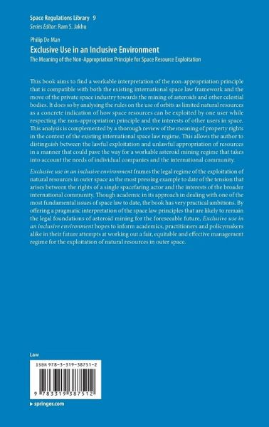 Exclusive use in an inclusive environment frames the legal regime of the exploitation of natural resources in outer space as the most pressing example to date of the tension that arises between the rights of a single spacefaring actor and the interests of the broader international community. Though academic in its approach in dealing with one of the most fundamental issues of space law to date, the book has very practical ambitions. By offering a pragmatic interpretation of the space law principles that are likely to remain the legal foundations of asteroid mining for the foreseeable future, Exclusive use in an inclusive environment hopes to inform academics, practitioners and policymakers alike in their future attempts at working out a fair, equitable and effective management regime for the exploitation of natural resources in outer space.