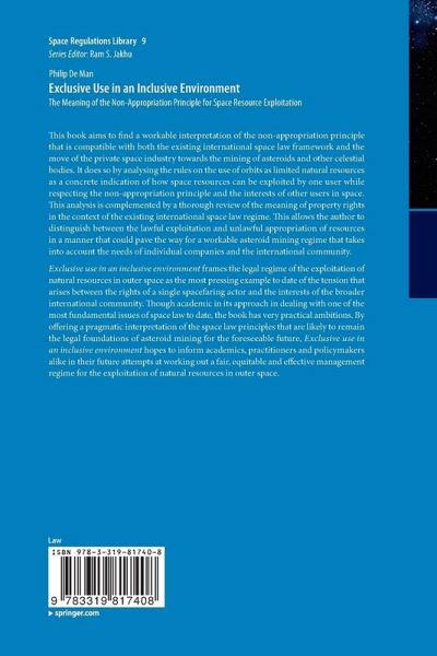 Exclusive use in an inclusive environment frames the legal regime of the exploitation of natural resources in outer space as the most pressing example to date of the tension that arises between the rights of a single spacefaring actor and the interests of the broader international community. Though academic in its approach in dealing with one of the most fundamental issues of space law to date, the book has very practical ambitions. By offering a pragmatic interpretation of the space law principles that are likely to remain the legal foundations of asteroid mining for the foreseeable future, Exclusive use in an inclusive environment hopes to inform academics, practitioners and policymakers alike in their future attempts at working out a fair, equitable and effective management regime for the exploitation of natural resources in outer space.