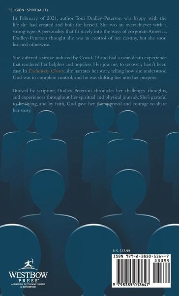 In February of 2021, author Toni Dudley-Peterson was happy with the life she had created and built for herself. She was an overachiever with a strong type-A personality that fit nicely into the ways of corporate America. Dudley-Peterson thought she was in control of her destiny, but she soon learned otherwise. She suffered a stroke induced by Covid-19 and had a near-death experience that rendered her helpless and hopeless. Her journey to recovery hasn't been easy. In Exclusively Chosen, she narrates her story, telling how she understood God was in complete control, and he was shifting her into her purpose. Buoyed by scripture, Dudley-Peterson chronicles her challenges, thoughts, and experiences throughout her spiritual and physical journey. She's grateful to be living, and by faith, God gave her the approval and courage to share her story.