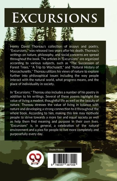 Henry David Thoreau's collection of essays and poetry, "Excursions," was released two years after his death. Thoreau's writings on nature, philosophy, and social concerns are spread throughout the book. The articles in "Excursions" are organized according to various subjects, such as "The Succession of Forest Trees," "A Trip to Wachusett," and "Natural History of Massachusetts." Thoreau utilizes his views of nature to explore further into philosophical issues including the way people interact with the natural world, what progress means, and the place of individuality in society. In "Excursions," Thoreau also includes a number of his poetry in addition to his writings. Several of these poems highlight the value of living a modest, thoughtful life as well as the beauty of nature. Thoreau stresses the value of living in balance with nature and developing a strong connection to it throughout the whole book. According to him, making this link may motivate people to strive towards a more fair and equal society as well as help them find meaning and purpose in their own lives. "Excursions" is, in general, a celebration of the natural environment and a plea for people to live more completely and purposefully every day.