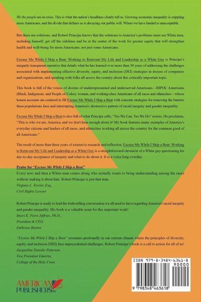 We the people are in crisis. This is what the nation's headlines clearly tell us. Growing economic inequality is crippling more Americans, and the divide that defines us is decaying our public will. Where we have landed is unacceptable. But there are solutions, and Robert Principe knows that the solutions to America's problems must see White men, including himself, get off the sidelines and be at the center of the work for greater equity that will strengthen health and well-being for more Americans, not just some Americans. Excuse Me While I Skip a Beat: Working to Reinvent My Life and Leadership as a White Guy is Principe's uniquely transparent narrative that details what he has learned over more than 30 years of addressing the challenges associated with implementing effective diversity, equity, and inclusion (DEI) strategies in dozens of companies and organizations, and speaking with folks all across the country about this critically important topic. This book is full of the voices of dozens of underrepresented and underserved Americans-BIPOC Americans (Black, Indigenous, and People of Color), women, and working-class Americans of all races and ethnicities-whose honest accounts are centered to fill Excuse Me While I Skip a Beat with concrete strategies for removing the barriers these populations face and interrupting America's destructive pattern of racial inequity and gender inequality. Excuse Me While I Skip a Beat is also full of what Principe calls, "Yes We Can, Yes We Do" stories. He proclaims, "This is who we are, America, and we don't hear enough about it! My book features many examples of America's everyday citizens, and leaders of all races, and ethnicities working all across the country for the common good of all Americans." The result of more than three years of extensive research and reflection, Excuse Me While I Skip a Beat: Working to Reinvent My Life and Leadership as a White Guy is a straightforward chronicle of a White guy questioning his day-to-day acceptance of inequity and what to do about it. It is a voice long overdue.