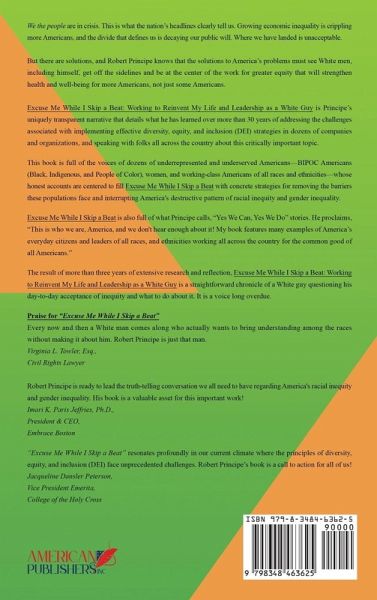 We the people are in crisis. This is what the nation's headlines clearly tell us. Growing economic inequality is crippling more Americans, and the divide that defines us is decaying our public will. Where we have landed is unacceptable. But there are solutions, and Robert Principe knows that the solutions to America's problems must see White men, including himself, get off the sidelines and be at the center of the work for greater equity that will strengthen health and well-being for more Americans, not just some Americans. Excuse Me While I Skip a Beat: Working to Reinvent My Life and Leadership as a White Guy is Principe's uniquely transparent narrative that details what he has learned over more than 30 years of addressing the challenges associated with implementing effective diversity, equity, and inclusion (DEI) strategies in dozens of companies and organizations, and speaking with folks all across the country about this critically important topic. This book is full of the voices of dozens of underrepresented and underserved Americans-BIPOC Americans (Black, Indigenous, and People of Color), women, and working-class Americans of all races and ethnicities-whose honest accounts are centered to fill Excuse Me While I Skip a Beat with concrete strategies for removing the barriers these populations face and interrupting America's destructive pattern of racial inequity and gender inequality. Excuse Me While I Skip a Beat is also full of what Principe calls, "Yes We Can, Yes We Do" stories. He proclaims, "This is who we are, America, and we don't hear enough about it! My book features many examples of America's everyday citizens, and leaders of all races, and ethnicities working all across the country for the common good of all Americans." The result of more than three years of extensive research and reflection, Excuse Me While I Skip a Beat: Working to Reinvent My Life and Leadership as a White Guy is a straightforward chronicle of a White guy questioning his day-to-day acceptance of inequity and what to do about it. It is a voice long overdue.