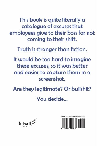 This book is quite literally a catalogue of excuses that employees give to their boss for not coming to their shift. Truth is stranger than fiction. It would be too hard to imagine these excuses, so it was better and easier to capture them in a screenshot. Are they legitimate? Or bullshit? You decide . . .