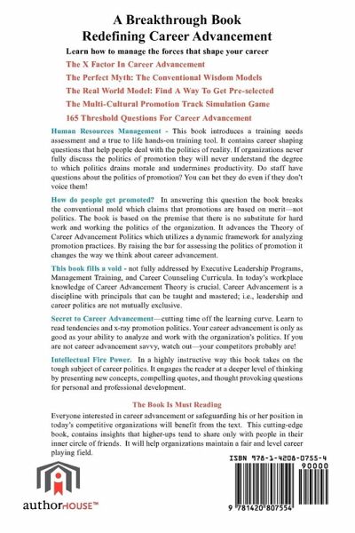 Learn how to manage the forces that shape your career The X Factor In Career Advancement The Perfect Myth: The Conventional Wisdom Models The Real World Model: Find A Way To Get Pre-selected The Multi cultural Promotion Track Simulation Game Achieving A Break Through: How To Effectively Use This Book Changing the Career Advancement Paradigm. The new paradigm states that there is no substitute for hard work and working the politics of the organization. Without dialogue about career politics organizations will never realize the degree to which politics drains morale and undermines productivity. If you are not career savvy, you can bet your competitors will be. The book promotes the development of better career decision making skills through an understanding of promotion politics. The book fills a void - not fully addressed by Executive Leadership Programs, Management Training and Career Counseling Curriculums. Career Advancement is a discipline with principles that can be taught and mastered. The secret to Career Advancement is cutting time off the learning curve. The book features a frame work that can help x-ray the organization's promotion practices. Your success is only as good as your ability to analyze and work with the organization's politics. The Art of Promotion Politics. The book engages the reader at a deeper level of thinking by presenting new concepts, compelling quotes and incisive career shaping questions. The Book Is Must Reading Anyone interested in career advancement or safeguarding their position in today's competitive organizations will benefit from the text. This cutting edge book, con- tains insights that higher-ups tend to share only with people in their comfort zone. It will help organizations maintain a fair and level career playing field.