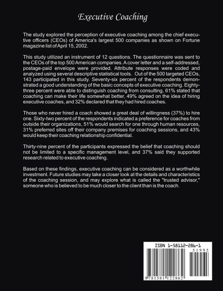 The study explored the perception of executive coaching among the chief executive officers (CEOs) of America's largest 500 companies as shown on Fortune magazine list of April 15, 2002. This study utilized an instrument of 12 questions. The questionnaire was sent to the CEOs of the top 500 American companies. A cover letter and a self-addressed, postage-paid envelope were provided. Attribute responses were coded and analyzed using several descriptive statistical tools. Out of the 500 targeted CEOs, 143 participated in this study. Seventy-six percent of the respondents demonstrated a good understanding of the basic concepts of executive coaching. Eighty-three percent were able to distinguish coaching from consulting, 61% stated that coaching can make their life somewhat better, 49% agreed on the idea of hiring executive coaches, and 32% declared that they had hired coaches. Those who never hired a coach showed a great deal of willingness (37%) to hire one. Sixty-two percent of the respondents indicated a preference for coaches from outside their organizations, 51% would search for one through human resources, 31% preferred sites off their company premises for coaching sessions, and 43% would keep their coaching relationship confidential. Thirty-nine percent of the participants expressed the belief that coaching should not be limited to a specific management level, and 37% said they supported research related to executive coaching. Based on these findings, executive coaching can be considered as a worthwhile investment. Future studies may take a closer look at the details and characteristics of the coaching session, and may explore what is called the "trusted advisor," someone who is believed to be much closer to the client than is the coach.