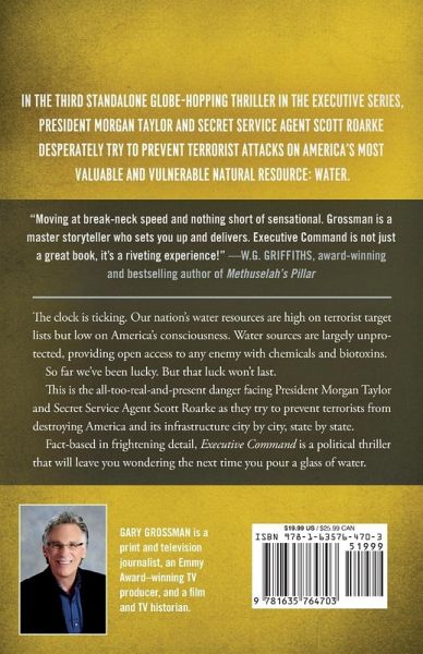 In the third standalone globe-hopping thriller in the Executive Series, Present Morgan Taylor and Secret Service Agent Scott Roarke desperately try to prevent terrorist attacks on America’s most valuable and vulnerable natural resource: Water. “Moving at break-neck speed and nothing short of sensational. Grossman is a master storyteller who sets you up and delivers. Executive Command is not just a great book, it’s a riveting experience!”—W.G. GRIFFITHS, award-winning and bestselling author of Methuselah’s Pillar The clock is ticking. Our nation’s water resources are high on terrorist target lists but low on America’s consciousness. Water sources are largely unprotected, providing open access to any enemy with chemicals and biotoxins. So far we’ve been lucky. But that luck won’t last. This is the all-too-real-and-present danger facing President Morgan Taylor and Secret Service Agent Scott Roarke as they try to prevent terrorists from destroying America and its infrastructure city by city, state by state. Fact-based in frightening detail, Executive Command is a political thriller that will leave you wondering the next time you pour a glass of water.
