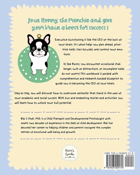 Give your child's brain a boost for success with this workbook on executive functioning. Does your child struggle with focusing or their attention span? Do they often find it hard to get started on important projects? Do they feel overwhelmed and have trouble managing their emotions?If so, there's a solution. In this engaging workbook, your child will go on a journey with the adorable Ronny the Frenchie as they conquer important executive functioning skills that will help them both in school, at home, and in the world. Child Therapist and author, Bibi S. Shah, provides a thorough and research-backed blueprint for helping your child become the CEO of their brain. Together with Ronny, she will show you, step by step, how to overcome obstacles that stand in the way of your child's academic and social success. With fun and endearing stories and activities, your child will learn how to maximize their skills and potential. In this workbook, you'll find 37 engaging activities to do alongside your child from helping them create a schedule to staying focused in school. You'll discover:Fun ways to help your child learn memory and focusing skills. How to create a routine with your child that they'll stick to. Tips for you as a parent along the way on how to help your child in each area. Easy-to-use templates for checklists, calendars, and more. Strategies to help your child embrace a growth mindset and an "I can do it" attitude. The power of the Buddy System for your child (and how to find the perfect accountability buddy). Easy-to-remember systems for impulsiveness such as T.H.I.N.K and STOP. How to use the Break It Down system to tackle large, daunting projects. Activities to help your child understand why they procrastinate (and how to tackle it). And much, much more!Invest in this workbook today and empower your child to reach their full potential!