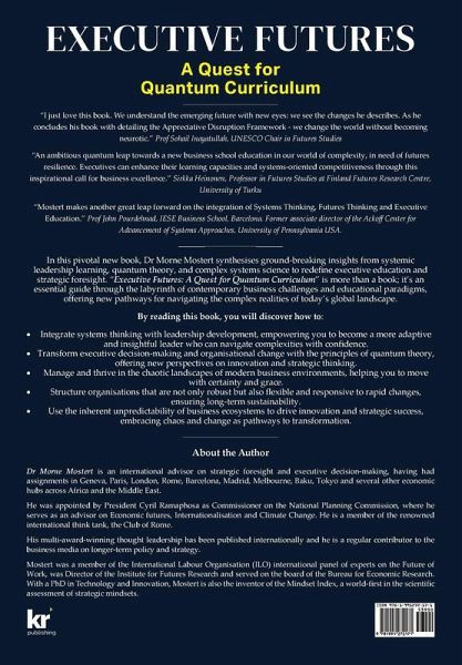 In this pivotal new book, Dr Morne Mostert synthesises ground-breaking insights from systemic leadership learning, quantum theory, and complex systems science to redefine executive education and strategic foresight. " Executive Futures: A Quest for Quantum Curriculum" is more than a book; it's an essential guide through the labyrinth of contemporary business challenges and educational paradigms, offering new pathways for navigating the complex realities of today's global landscape. As we stand at the precipice of unparalleled change, the old models of executive development are rapidly becoming obsolete. The new science of complexity and systems thinking provides a fresh lens through which we can reinterpret and enhance the roles of leaders and their organisations. With his extensive experience on the global stage, including his role as a Commissioner on the National Planning Commission, Mostert argues for a profound transformation in how we think about and engage with our educational systems and leadership practices. This book invites readers to break free from traditional confines and explore the quantum curriculum, a dynamic new approach to learning and leadership that leverages chaos, embraces complexity, and fosters profound systemic change. By reading this book, you will discover how to: Integrate systems thinking with leadership development, empowering you to become a more adaptive and insightful leader who can navigate complexities with confidence.Transform executive decision-making and organisational change with the principles of quantum theory, offering new perspectives on innovation and strategic thinking.Manage and thrive in the chaotic landscapes of modern business environments, helping you to move with certainty and grace.Structure organisations that are not only robust but also flexible and responsive to rapid changes, ensuring long-term sustainability.Use the inherent unpredictability of business ecosystems to drive innovation and strategic success, embracing chaos and change as pathways to transformation.