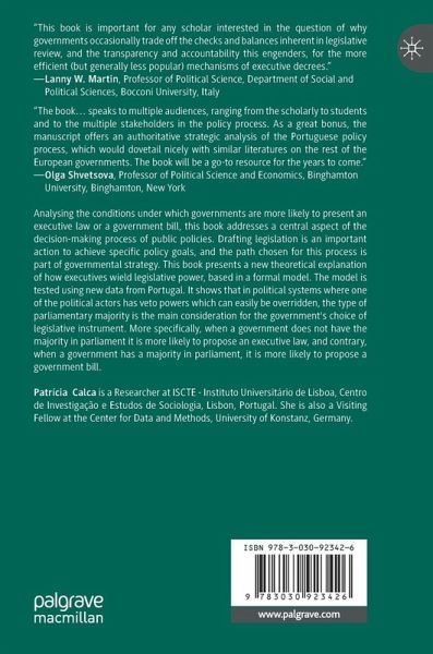 Analysing the conditions under which governments are more likely to present an executive law or a government bill, this book addresses a central aspect of the decision-making process of public policies. Drafting legislation is an important action to achieve specific policy goals, and the path chosen for this process is part of governmental strategy. This book presents a new theoretical explanation of how executives wield legislative power, based in a formal model. The model is tested using new data from Portugal. It shows that in political systems where one of the political actors has veto powers which can easily be overridden, the type of parliamentary majority is the main consideration for the government's choice of legislative instrument. More specifically, when a government does not have the majority in parliament it is more likely to propose an executive law, and contrary, when a government has a majority in parliament, it is more likely to propose a government bill.