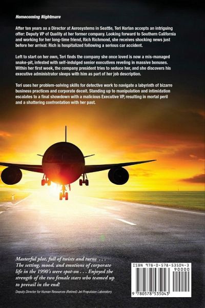 After ten years as a Director at Aerosystems in Seattle, Teri Harlan accepts an intriguing offer: Deputy VP of Quality at her former company. Looking forward to Southern California and working for her long-time friend, Rich Richmond, she receives shocking news just before her arrival: Rich is hospitalized following a serious car accident. Left to start on her own, Teri finds the company she once loved is now a mis-managed snake-pit, infested with self-indulged senior executives reveling in massive bonuses. Within her first week, the company president tries to seduce her, and she discovers his executive administrator sleeps with him as part of her job description. Teri uses her problem-solving skills for detective work to navigate a labyrinth of bizarre business practices and corporate deceit. Standing up to manipulation and intimidation escalates to a final showdown with a malicious Executive VP, resulting in mortal peril and a shattering confrontation with her past.