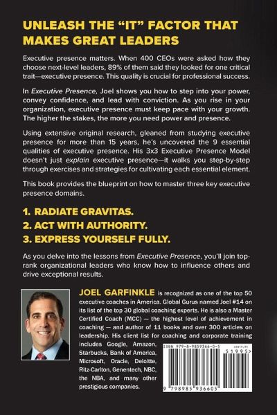 Executive presence matters. When 400 CEOs were asked how they choose next-level leaders, 89% of them said they looked for one critical trait-executive presence. This quality is crucial for professional success. In Executive Presence, Joel Garfinkle shows you how to step into your power, convey confidence, and lead with conviction. As you rise in your organization, your executive presence must keep pace with your growth. The higher the stakes, the more you need that power and presence. Using extensive original research gleaned from studying executive presence for more than 15 years, Joel has uncovered the 9 essential qualities of executive presence. His 3x3 Executive Presence Model doesn't just explain executive presence for the modern leader-it walks you step by step through exercises and strategies for cultivating each essential element. Methodically explaining how to master each one, he equips you with a personalized plan for growth, demystifies what executive presence is, and debunks misconceptions that hold you back. This book provides the blueprint for how to master 3 key executive presence domains. 1. Radiate gravitas. 2. Act with authority. 3. Express yourself fully. In Executive Presence, you'll learn how to: - Radiate the commanding, self-assured presence of a high-level leader. - Bring power, conviction, and a strong point of view to your presentations. - Move from passivity and self-doubt to self-assurance and bold decision-making. - Exude a professional magnetism that influences others at every level. - Cultivate and leverage charisma in all your interactions. - Communicate in a clear, crisp, and concise way. Maybe you've come across the term "executive presence" in HBR, but you couldn't adequately define it-let alone begin to grow it. This book will change that. As you delve into the lessons from Executive Presence, you'll join top-ranking organizational leaders who know how to influence others and drive extraordinary results. Whether you're a rising star or CEO, Executive Presence will guide you in leading a high-performing team. Moving from passivity and self-doubt to self-assurance and bold decision-making, you'll become the high-impact leader who propels your organization forward. Executive Presence is for women, people of color, and other employees from marginalized groups who are too often underappreciated, which causes companies to miss out on their full range of talent. By cultivating executive presence, women and any overlooked employees can smash through the glass ceiling and gain the recognition they deserve. If you're in one of these demographics, growing your executive presence will allow you to leap over the barriers you may encounter in your career. What's the key differentiator between this Executive Presence book and its competitors (Sylvia Ann Hewlett's Executive Presence: The Missing Link Between Merit and Success, Paul Aldo's Understanding Executive Presence, Debra A. Benton's Executive Presence for the Modern Leader, and Harrison Monarth's Executive Presence, Second Edition)? The 3x3 Executive Presence Model provides a clear, structured blueprint for developing the most important facets of executive presence. Learn about the 3 domains - gravitas, authority, and expression - that act as the foundational pillars holding up the 9 executive presence competencies.