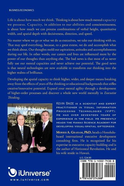 Life is about how much we think. Thinking is about how much mental capacity we possess. Capacity, in addition to our abilities and conscientiousness, is about how much we can process combinations of verbal height, quantitative width, and spatial depth with decisiveness, direction, and speed. No matter where we go or what we do as executives, we take our thinking with us. That may spoil everything, because, to a great extent, we do and accomplish what we think about. Our thoughts mold our aspirations, attitudes and accomplishments during our life. In other words, our careers and lives are influenced more by the power of our thoughts than anything else. The bad news is that most of us never fully use our mental capacities and never achieve our potential. The good news is that neural technologies are now available to transform our thinking into the higher realms of brilliance. Developing the spatial capacity to think higher, wider, and deeper means breaking away from the effects of years of flat thinking or educational backgrounds that stifles creative/innovative potential. Expand your mental agility through a development of higher-order processes and discover a whole new world mentally in Executive Thinking.