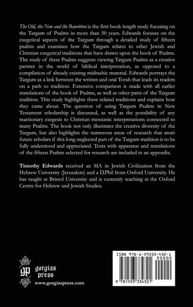 The Old, the New and the Rewritten illustrates how Targum Psalms creatively interprets selected psalms and how those interpretations relate to other Jewish and Christian traditions, including early translations of the psalms, rabbinic Midrashim, the New Testament and early Church Fathers. The study of these Psalms suggests viewing Targum Psalms as a creative partner in the world of biblical interpretation, as opposed to a compilation of already existing midrashic material. Edwards portrays the Targum as a link between the written and oral Torah that leads its readers on a path to tradition.