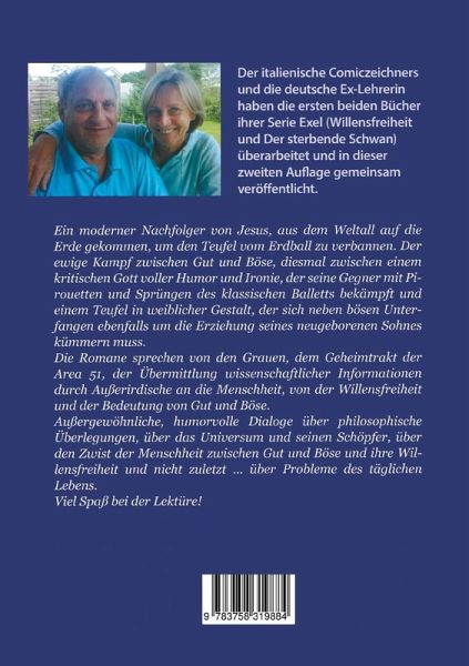 Der italienische Comiczeichner und die deutsche Ex-Lehrerin haben die ersten beiden Bücher ihrer Serie Exel (Willensfreiheit und Der Sterbende Schwan) überarbeitet und in dieser zweiten Auflage gemeinsam veröffentlicht.Ein moderner Nachfolger von Jesus, aus dem Weltall auf die Erde gekommen, um den Teufel vom Erdball zu verbannen. Der ewige Kampf zwischen Gut und Böse, diesmal zwischen einem kritischen Gott voller Humor und Ironie, der seine Gegner mit Pirouetten und Sprüngen des klassischen Balletts bekämpft, undeinem Teufel in weiblicher Gestalt, der sich neben bösen Unterfangen ebenfalls um die Erziehung seines neugeborenen Sohnes kümmern muss.Die Romane sprechen von den Grauen, dem Geheimtrakt der Area 51, der Übermittlung wissenschaftlicher Informationen durch Außerirdische an die Menschheit, von der Willensfreiheit und der Bedeutung von Gut und Böse.Außergewöhnliche, humorvolle Dialoge über philosophische Überlegungen, über das Universum und seinen Schöpfer, über den Zwist der Menschen zwischen Gut und Böse und ihre Willensfreiheit und nicht zuletzt ... über Probleme des täglichen Lebens.Viel Spaß bei der Lektüre!