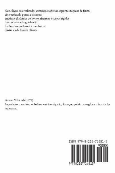 Neste livro, são realizados exercícios sobre os seguintes tópicos de física: cinemática do ponto e sistemas estática e dinâmica do ponto, sistemas e corpos rígidos teoria clássica da gravitação fenômenos oscilatórios mecânicos dinâmica de fluidos clássica