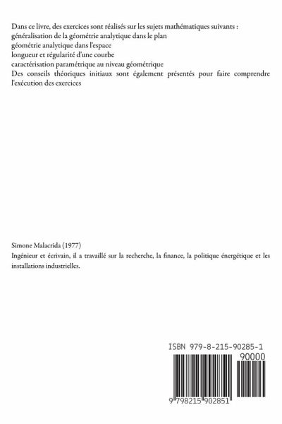 Dans ce livre, des exercices sont réalisés sur les sujets mathématiques suivants : généralisation de la géométrie analytique dans le plan géométrie analytique dans l'espace longueur et régularité d'une courbe caractérisation paramétrique au niveau géométrique Des conseils théoriques initiaux sont également présentés pour faire comprendre l'exécution des exercices
