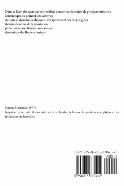 Dans ce livre, des exercices sont réalisés concernant les sujets de physique suivants : cinématique du point et des systèmes statique et dynamique du point, des systèmes et des corps rigides théorie classique de la gravitation phénomènes oscillatoires mécaniques dynamique des fluides classique
