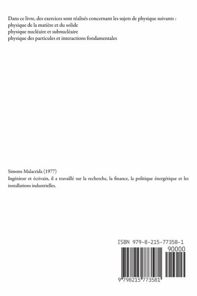 Dans ce livre, des exercices sont réalisés concernant les sujets de physique suivants : physique de la matière et du solide physique nucléaire et subnucléaire physique des particules et interactions fondamentales