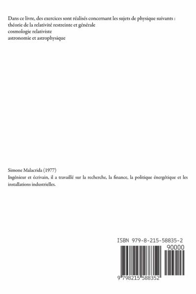 Dans ce livre, des exercices sont réalisés concernant les sujets de physique suivants : théorie de la relativité restreinte et générale cosmologie relativiste astronomie et astrophysique