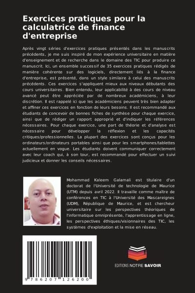 Après vingt séries d'exercices pratiques présentés dans les manuscrits précédents, je me suis inspiré de mon expérience universitaire en matière d'enseignement et de recherche dans le domaine des TIC pour produire ce manuscrit. Ici, un ensemble successif de 35 exercices pratiques rédigés de manière cohérente sur des logiciels, directement liés à la finance d'entreprise, est présenté, dans un style similaire à celui des manuscrits précédents. Ces exercices s'appliquent mieux aux niveaux débutants des cours universitaires. Bien entendu, leur applicabilité à des cours de niveau avancé peut être appréciée par de nombreux académiciens, à leur discrétion. Il est rappelé ici que les académiciens peuvent très bien adapter et affiner ces exercices en fonction de leurs besoins. Il est recommandé aux étudiants de concevoir de bonnes fiches de synthèse pour chaque exercice, ainsi que de rédiger un rapport approprié et d'indiquer les références nécessaires. Pour chaque exercice, une part de théorie et d'analyse est nécessaire pour développer la réflexion et les capacités critiques/professionnelles. La plupart des exercices sont conçus pour les ordinateurs/ordinateurs portables ainsi que pour les smartphones/tablettes actuellement en vogue. Les étudiants doivent communiquer correctement avec leur coach qui, à son tour, est recommandé pour effectuer un suivi judicieux et donner les conseils nécessaires.
