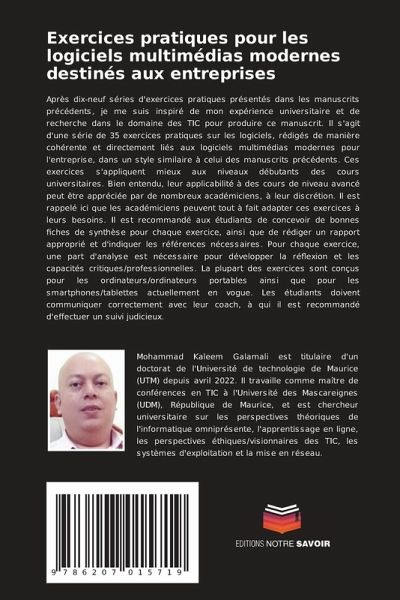 Après dix-neuf séries d'exercices pratiques présentés dans les manuscrits précédents, je me suis inspiré de mon expérience universitaire et de recherche dans le domaine des TIC pour produire ce manuscrit. Il s'agit d'une série de 35 exercices pratiques sur les logiciels, rédigés de manière cohérente et directement liés aux logiciels multimédias modernes pour l'entreprise, dans un style similaire à celui des manuscrits précédents. Ces exercices s'appliquent mieux aux niveaux débutants des cours universitaires. Bien entendu, leur applicabilité à des cours de niveau avancé peut être appréciée par de nombreux académiciens, à leur discrétion. Il est rappelé ici que les académiciens peuvent tout à fait adapter ces exercices à leurs besoins. Il est recommandé aux étudiants de concevoir de bonnes fiches de synthèse pour chaque exercice, ainsi que de rédiger un rapport approprié et d'indiquer les références nécessaires. Pour chaque exercice, une part d'analyse est nécessaire pour développer la réflexion et les capacités critiques/professionnelles. La plupart des exercices sont conçus pour les ordinateurs/ordinateurs portables ainsi que pour les smartphones/tablettes actuellement en vogue. Les étudiants doivent communiquer correctement avec leur coach, à qui il est recommandé d'effectuer un suivi judicieux.