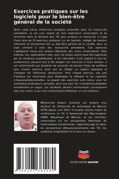 Après seize séries d'exercices pratiques présentés dans les manuscrits précédents, je me suis inspiré de mon expérience universitaire et de recherche dans le domaine des TIC pour produire ce manuscrit. Il s'agit d'une série de 35 exercices pratiques sur les logiciels, rédigés de manière cohérente et directement liés au bien-être général de la société, dans un style similaire à celui des manuscrits précédents. Ces exercices s'appliquent mieux aux niveaux débutants des cours universitaires. Bien entendu, leur applicabilité à des cours de niveau avancé peut être appréciée par de nombreux académiciens, à leur discrétion. Il est rappelé ici que les académiciens peuvent tout à fait adapter ces exercices à leurs besoins. Il est recommandé aux étudiants de concevoir de bonnes fiches de synthèse pour chaque exercice, ainsi que de rédiger un rapport approprié et d'indiquer les références nécessaires. Pour chaque exercice, une part d'analyse est nécessaire pour développer la réflexion et les capacités critiques/professionnelles. La plupart des exercices sont conçus pour les ordinateurs/ordinateurs portables ainsi que pour les smartphones/tablettes actuellement en vogue. Les étudiants doivent communiquer correctement avec leur coach, à qui il est recommandé d'effectuer un suivi judicieux.