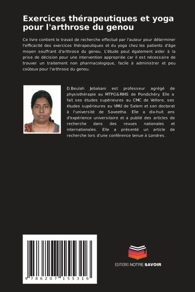Ce livre contient le travail de recherche effectué par l'auteur pour déterminer l'efficacité des exercices thérapeutiques et du yoga chez les patients d'âge moyen souffrant d'arthrose du genou. L'étude peut également aider à la prise de décision pour une intervention appropriée car il est nécessaire de trouver un traitement non pharmacologique, facile à administrer et peu coûteux pour l'arthrose du genou.