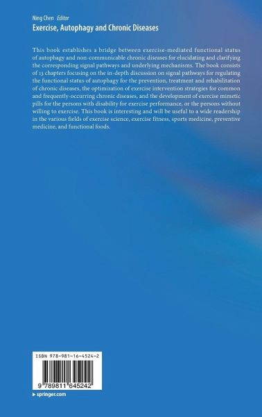 Chapter 1. Molecular processes and regulation of autophagy.- Chapter 2. Acute and chronic exercise on autophagy.- Chapter 3. The beneficial roles of exercise-mediated autophagy in T2DM.- Chapter 4. Exercise-induced autophagy and obesity.- 5. Exercise-mediated autophagy and non-alcoholic fatty liver disease.- Chapter 6. Exercise-mediated autophagy and brain aging.- Chapter 7. Exercise-mediated autophagy and Alzheimer's disease.- Chapter 8. Exercise-induced autophagy and Parkinson's disease.- Chapter 9.Exercise-mediated autophagy in cardiovascular diseases.- Chapter 10. Exercise-induced autophagy in the prevention and treatment of sarcopenia.- Chapter 11. Prospective advances in exercise-induced autophagy on health.- Chapter 12. Exercise mimetic pills for chronic diseases based on autophagy.- Chapter 13. Exercise-mediated functional status of autophagy is beneficial to health.