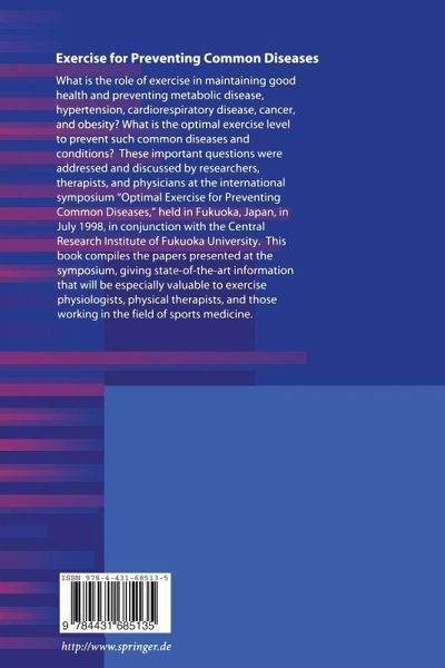 What is the role of exercise in maintaining good health and preventing metabolic disease, hypertension, cardiorespiratory disease, cancer, and obesity? What is the optimal exercise level to prevent such common diseases and conditions? These important questions were addressed and discussed by researchers, therapists, and physicians at the international symposium "Optimal Exercise for Preventing Common Diseases," held in Fukuoka, Japan, in July 1998, in conjunction with the Fukuoka University Research Center. This book compiles the papers presented at the symposium, giving state-of-the-art information that will be especially valuable to exercise physiologists, physical therapists, and those working in the field of sports medicine.