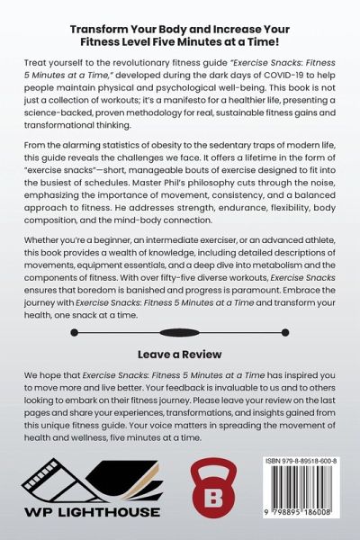 Transform Your Body and Increase Your Fitness Level Five Minutes at a Time! Treat yourself to the revolutionary fitness guide "Exercise Snacks: Fitness 5 Minutes at a Time," developed during the dark days of COVID-19 to help people maintain physical and psychological well-being. This book is not just a collection of workouts; it's a manifesto for a healthier life, presenting a science-backed, proven methodology for real, sustainable fitness gains and transformational thinking. From the alarming statistics of obesity to the sedentary traps of modern life, this guide reveals the challenges we face. It offers a lifetime in the form of "exercise snacks"-short, manageable bouts of exercise designed to fit into the busiest of schedules. Master Phil's philosophy cuts through the noise, emphasizing the importance of movement, consistency, and a balanced approach to fitness. He addresses strength, endurance, flexibility, body composition, and the mind-body connection. Whether you're a beginner, an intermediate exerciser, or an advanced athlete, this book provides a wealth of knowledge, including detailed descriptions of movements, equipment essentials, and a deep dive into metabolism and the components of fitness. With over fifty-five diverse workouts, Exercise Snacks ensures that boredom is banished and progress is paramount. Embrace the journey with Exercise Snacks: Fitness 5 Minutes at a Time and transform your health, one snack at a time. Leave a Review We hope that Exercise Snacks: Fitness 5 Minutes at a Time has inspired you to move more and live better. Your feedback is invaluable to us and to others looking to embark on their fitness journey. Please leave your review on the last pages and share your experiences, transformations, and insights gained from this unique fitness guide. Your voice matters in spreading the movement of health and wellness, five minutes at a time.