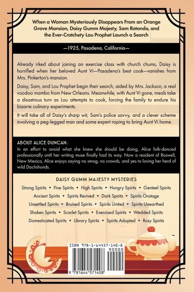 When a Woman Mysteriously Disappears From an Orange Grove Mansion, Daisy Gumm Majesty, Sam Rotondo, and the Ever Crotchety Lou Prophet Launch A Search in Exercised Spirits, a Cozy Historical Mystery by Alice Duncan -1925, Pasadena, California- Already irked about having to participate in an exercise class with some church chums, Daisy is horrified when her beloved Aunt Vi-the greatest cook in Pasadena-goes missing from her place of employment, Mrs. Pinkerton's mansion on Orange Grove Street. Daisy, Sam and Lou Prophet launch a search, with some help from Mrs. Jackson, a real live Voodoo mambo from New Orleans, who is at present living in Altadena. In the meantime, food preparation in the Gumm/Majesty/Rotondo households takes a severe downturn. Lou Prophet lends a hand, and the family finds themselves choking down some concoctions they never even knew existed. It's going to take all the shrewd sleuthing Daisy can muster plus Sam, a peg-legged man, and some clever roping to bring Aunt Vi home. From the Publisher: The Daisy Gumm Majesty Cozy Mystery Series is a light-hearted mystery in a historical setting. There are no explicit sexual scenes and minimal cursing (Lou Prophet can be a little coarse) and will be enjoyed by readers who appreciate clean and wholesome reads. Fans of Carola Dunn, Amanda Quick, Elizabeth Peters, Rhys Bowen, and M. Louisa Locke will not want to miss this series.