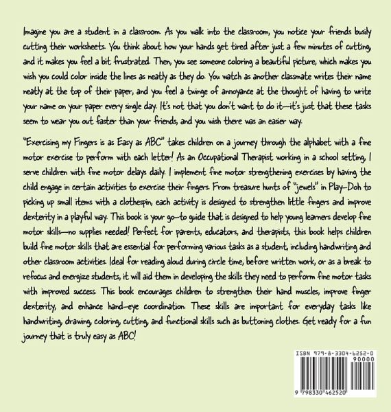 "Exercising my Fingers is as Easy as ABC" takes children on a journey through the alphabet with a fine motor exercise to perform with each letter! As an Occupational Therapist working in a school setting, I serve children with fine motor delays daily. I implement fine motor strengthening exercises by having the child engage in certain activities to exercise their fingers. From treasure hunts of "jewels" in Play-Doh to picking up small items with a clothespin, each activity is designed to strengthen little fingers and improve dexterity in a playful way. This book is your go-to guide that is designed to help young learners develop fine motor skills-no supplies needed! Perfect for parents, educators, and therapists, this book helps children build fine motor skills that are essential for performing various tasks as a student, including handwriting and other classroom activities. Ideal for reading aloud during circle time, before written work, or as a break to refocus and energize students, it will aid them in developing the skills they need to perform fine motor tasks with improved success. This book encourages children to strengthen their hand muscles, improve finger dexterity, and enhance hand-eye coordination. These skills are important for everyday tasks like handwriting, drawing, coloring, cutting, and functional skills such as buttoning clothes. Get ready for a fun journey that is truly easy as ABC!