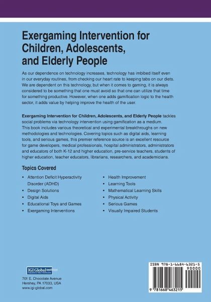As our dependence on technology increases, technology has imbibed itself even in our everyday routines, from checking our heart rate to keeping tabs on our diets. We are dependent on this technology, but when it comes to gaming, it is always considered to be something that one must avoid so that one can utilize that time for something productive. However, when one adds gamification logic to the health sector, it adds value by helping improve the health of the user. Exergaming Intervention for Children, Adolescents, and Elderly People tackles social problems via technology intervention using gamification as a medium. This book includes various theoretical and experimental breakthroughs on new methodologies and technologies. Covering topics such as digital aids, learning tools, and serious games, this premier reference source is an excellent resource for game developers, medical professionals, hospital administrators, administrators and educators of both K-12 and higher education, pre-service teachers, students of higher education, teacher educators, librarians, researchers, and academicians.