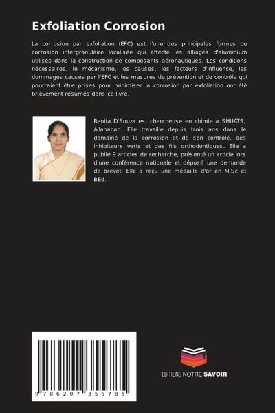 La corrosion par exfoliation (EFC) est l'une des principales formes de corrosion intergranulaire localisée qui affecte les alliages d'aluminium utilisés dans la construction de composants aéronautiques. Les conditions nécessaires, le mécanisme, les causes, les facteurs d'influence, les dommages causés par l'EFC et les mesures de prévention et de contrôle qui pourraient être prises pour minimiser la corrosion par exfoliation ont été brièvement résumés dans ce livre.